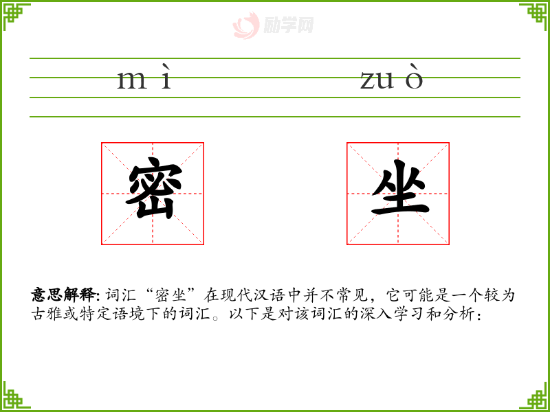 词汇“密坐”在现代汉语中并不常见,它可能是一个较为古雅或特定语境下的词汇。以下是对该词汇的深入学*和分析: