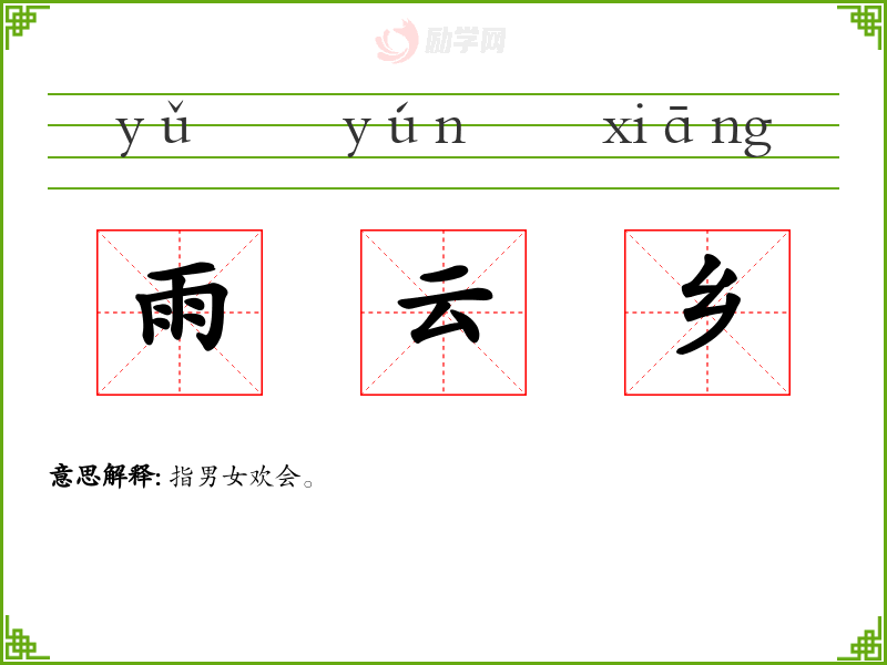 雨云乡的意思是:指男女欢会。