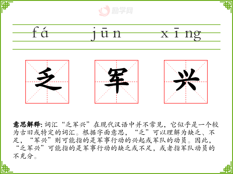 词汇“乏军兴”在现代汉语中并不常见,它似乎是一个较为古旧或特定的词汇。根据字面意思,“乏”可以理解为缺乏、不足,“军兴”则可能指的是军事行动的兴起或军队的动员。因此,“乏军兴”可能指的是军事行动的缺乏或不足,或者指军队动员的不充分。