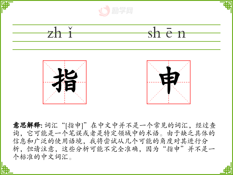 由于“指申”不是一个标准词汇,我们无法给出一个确切的基本定义。它可能是某个特定领域(如法律、金融或技术)的术语,或者是某个方言中的词汇。