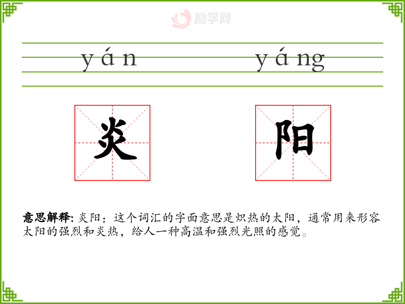 “炎阳”这个词汇在中文中是一个非常形象和生动的表达,能够很好地传达出夏日酷热的感觉。在学*语言和表达时,掌握这样的词汇能够丰富我们的语言表达能力,使我们的描述更加生动和具体。