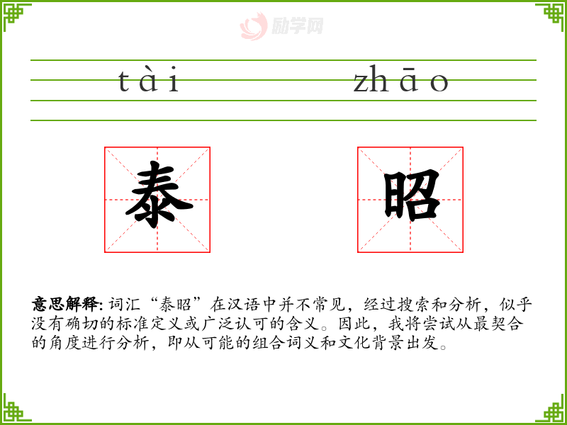 词汇“泰昭”在汉语中并不常见,经过搜索和分析,似乎没有确切的标准定义或广泛认可的含义。因此,我将尝试从最契合的角度进行分析,即从可能的组合词义和文化背景出发。