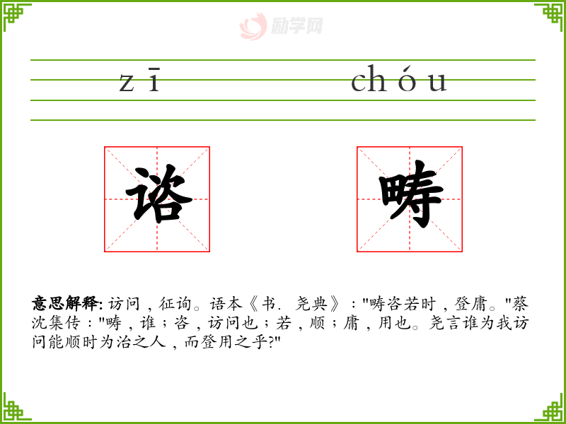 谘畴的意思是:访问﹐征询。语本《书.尧典》﹕"畴咨若时﹐登庸。"蔡沈集传﹕"畴﹐谁﹔咨﹐访问也﹔若﹐顺﹔庸﹐用也。尧言谁为我访问能顺时为治之人﹐而登用之乎?"