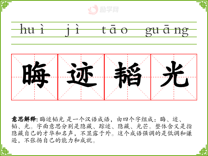 晦迹韬光 是一个汉语成语,由四个字组成:晦、迹、韬、光。字面意思分别是隐藏、踪迹、隐藏、光芒。整体含义是指隐藏自己的才华和名声,不显露于外。这个成语强调的是低调和谦逊,不张扬自己的能力和成就。