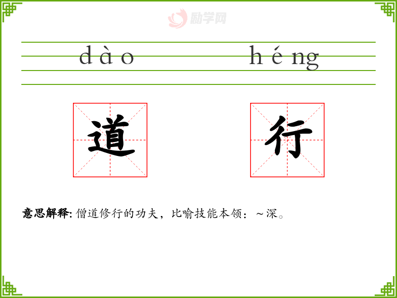道行的意思是:僧道修行的功夫,比喻技能本领:~深。