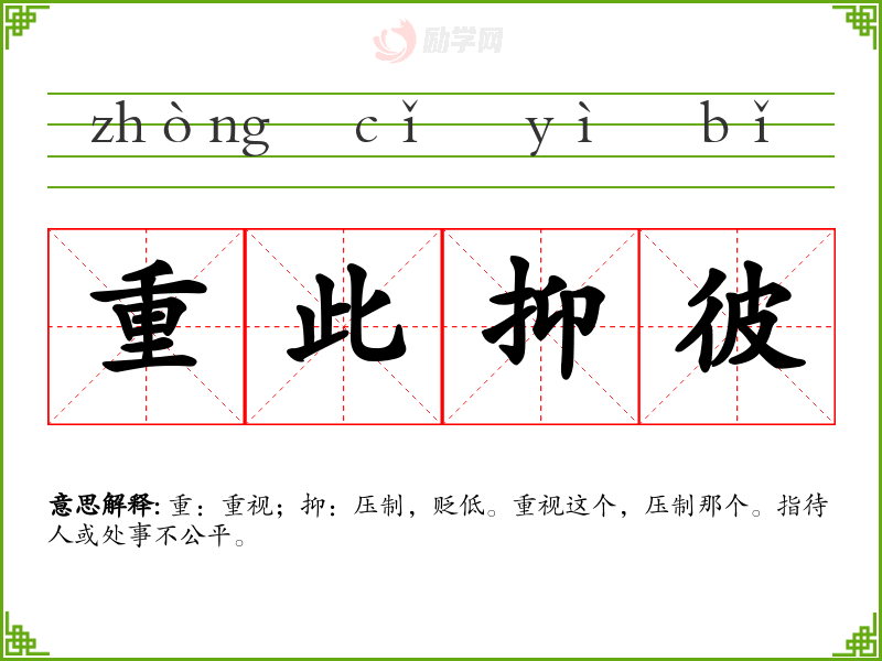 重此抑彼的意思是:重:重视;抑:压制,贬低。重视这个,压制那个。指待人或处事不公平。