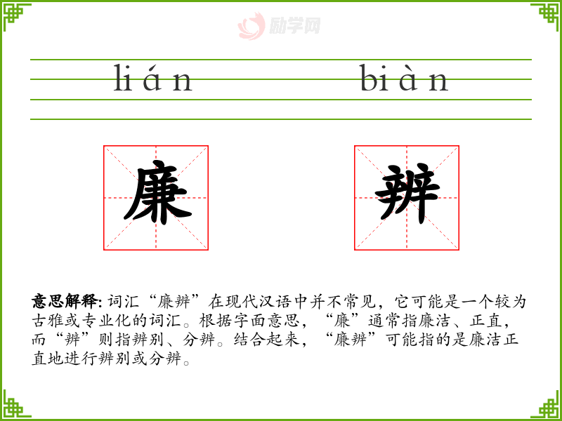 词汇“廉辨”在现代汉语中并不常见,它可能是一个较为古雅或专业化的词汇。根据字面意思,“廉”通常指廉洁、正直,而“辨”则指辨别、分辨。结合起来,“廉辨”可能指的是廉洁正直地进行辨别或分辨。