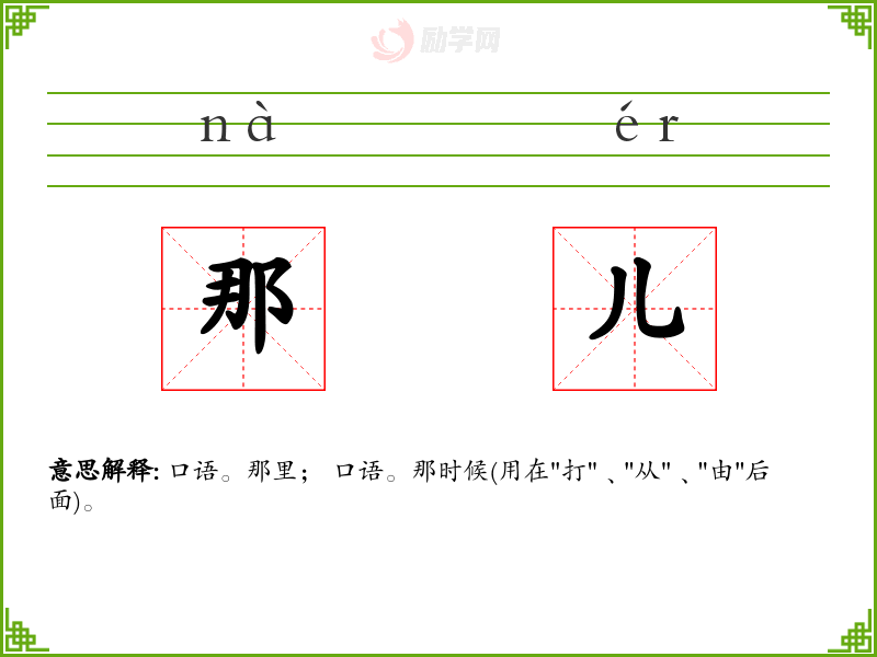 那儿的意思是:口语。那里; 口语。那时候(用在"打"﹑"从"﹑"由"后面)。