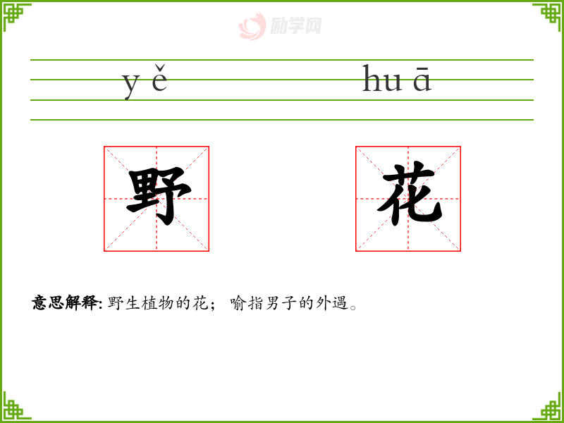 野花的意思是:野生植物的花; 喻指男子的外遇。