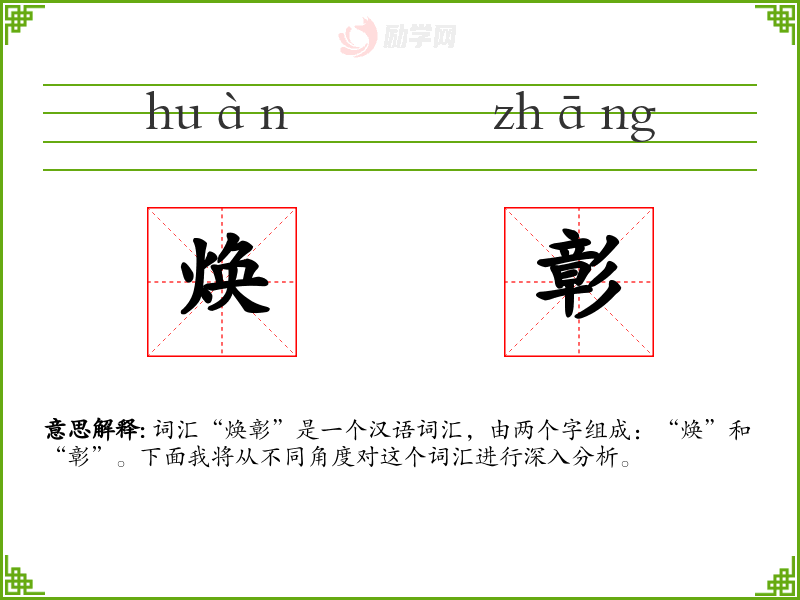 - 词源:“焕”和“彰”都是古代汉语词汇,历史悠久。