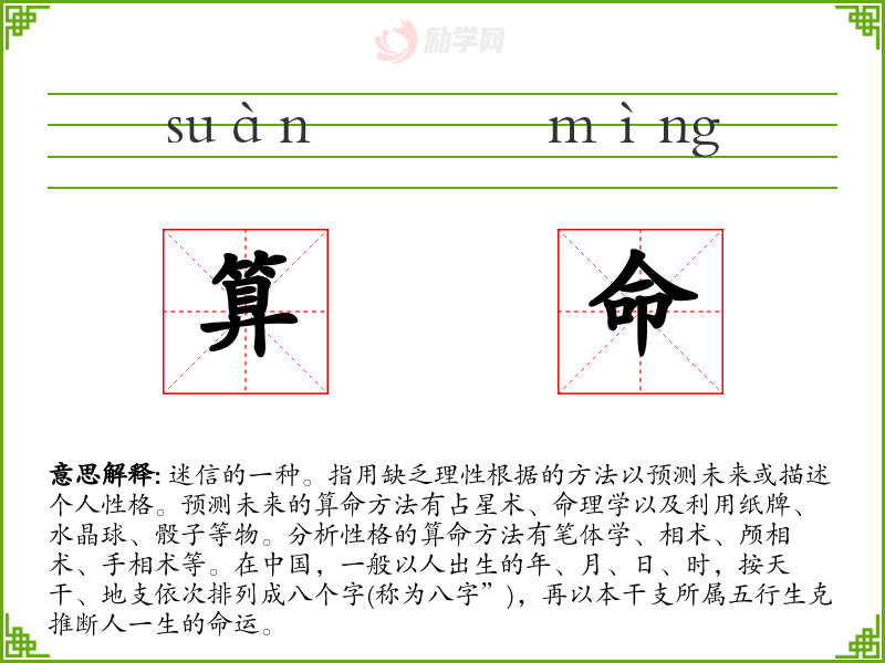 算命的意思是:迷信的一种。指用缺乏理性根据的方法以预测未来或描述个人性格。预测未来的算命方法有占星术、命理学以及利用纸牌、水晶球、骰子等物。分析性格的算命方法有笔体学、相术、颅相术、手相术等。在中国,一般以人出生的年、月、日、时,按天干、地支依次排列成八个字(称为八字”),再以本干支所属五行生克推断人一生的命运。