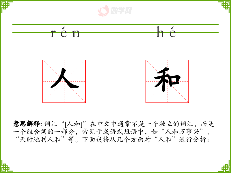 - 文学:在文学作品中,“人和”常用来强调和谐的社会关系对个人和集体的重要性。