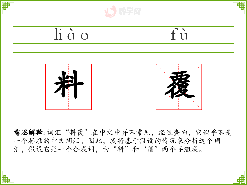 词汇“料覆”在中文中并不常见,经过查询,它似乎不是一个标准的中文词汇。因此,我将基于假设的情况来分析这个词汇,假设它是一个合成词,由“料”和“覆”两个字组成。