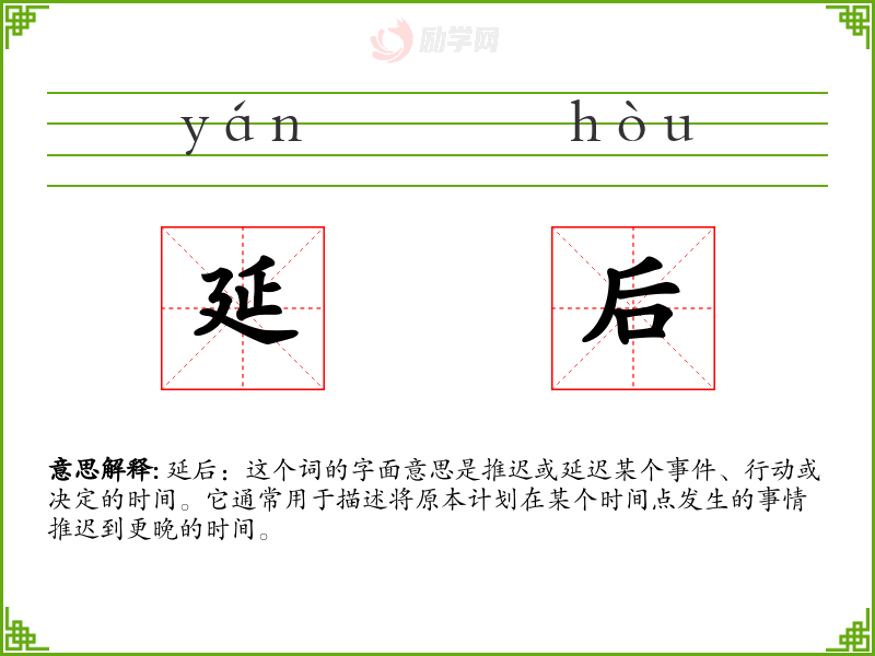 延后:这个词的字面意思是推迟或延迟某个**、行动或决定的时间。它通常用于描述将原本计划在某个时间点发生的事情推迟到更晚的时间。