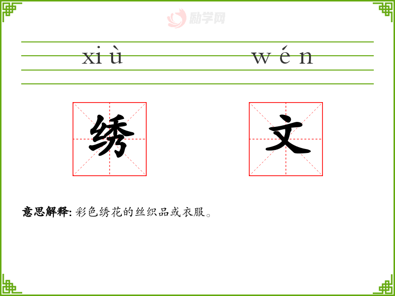 绣文的意思是:彩色绣花的丝织品或衣服。