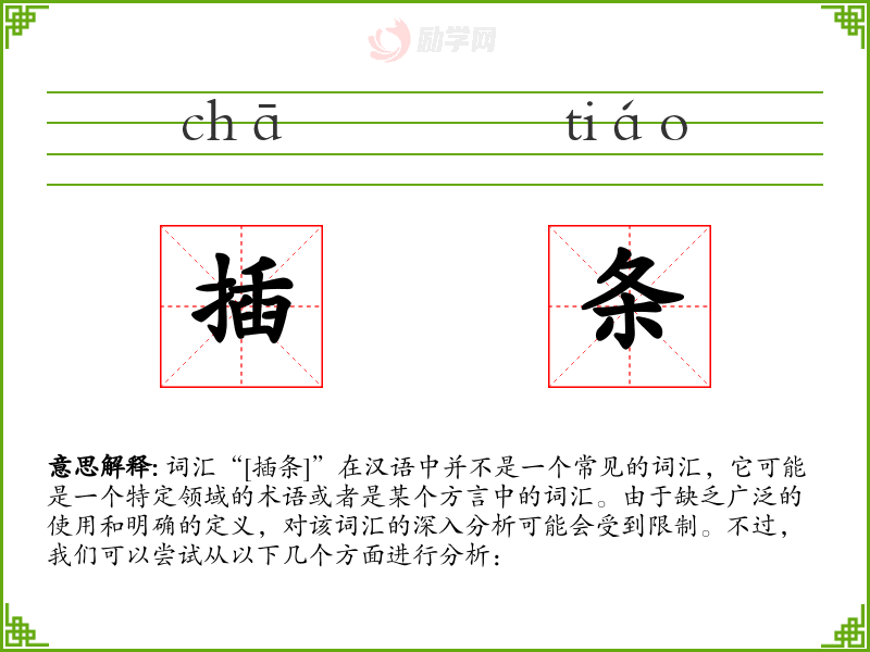 综上所述,由于“[插条]”不是一个标准汉语词汇,对其进行深入分析存在一定的困难。如果该词汇是某个特定领域的术语或者是某个方言中的词汇,那么对其的理解和分析将需要更多的背景知识和具体语境的支持。