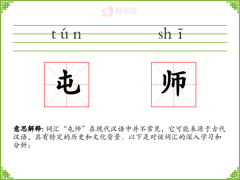 词汇“屯师”在现代汉语中并不常见,它可能来源于古代汉语,具有特定的历史和文化背景。以下是对该词汇的深入学*和分析: