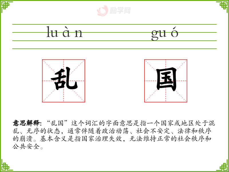 “乱国”这个词汇的字面意思是指一个国家或地区处于混乱、无序的状态,通常伴随着政治动荡、社会不安定、法律和秩序的崩溃。基本含义是指国家治理失效,无法维持正常的社会秩序和公共安全。