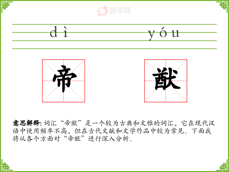 词汇“帝猷”是一个较为古典和文雅的词汇,它在现代汉语中使用频率不高,但在古代文献和文学作品中较为常见。下面我将从各个方面对“帝猷”进行深入分析。