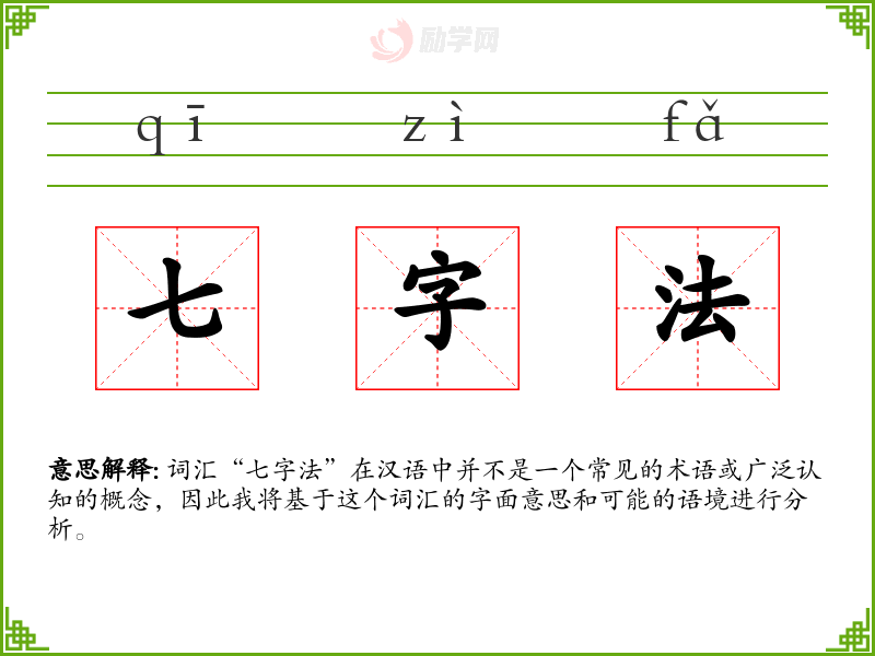 词汇“七字法”在汉语中并不是一个常见的术语或广泛认知的概念,因此我将基于这个词汇的字面意思和可能的语境进行分析。