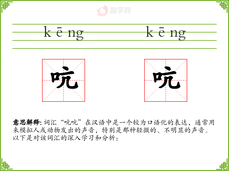 词汇“吭吭”在汉语中是一个较为口语化的表达,通常用来模拟人或动物发出的声音,特别是那种轻微的、不明显的声音。以下是对该词汇的深入学习和分析: