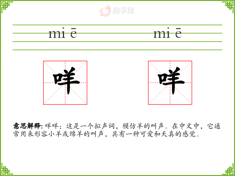 咩咩:这是一个拟声词,模仿羊的叫声。在中文中,它通常用来形容小羊或绵羊的叫声,具有一种可爱和天真的感觉。