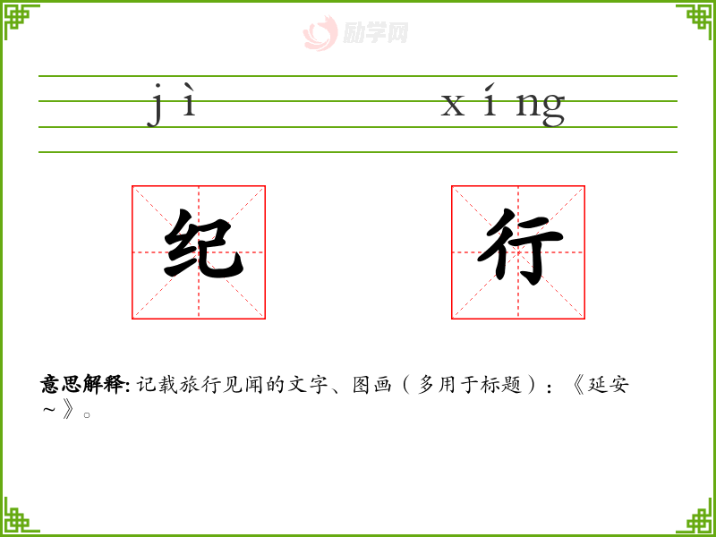 纪行的意思是:记载旅行见闻的文字、图画(多用于标题):《延安~》。