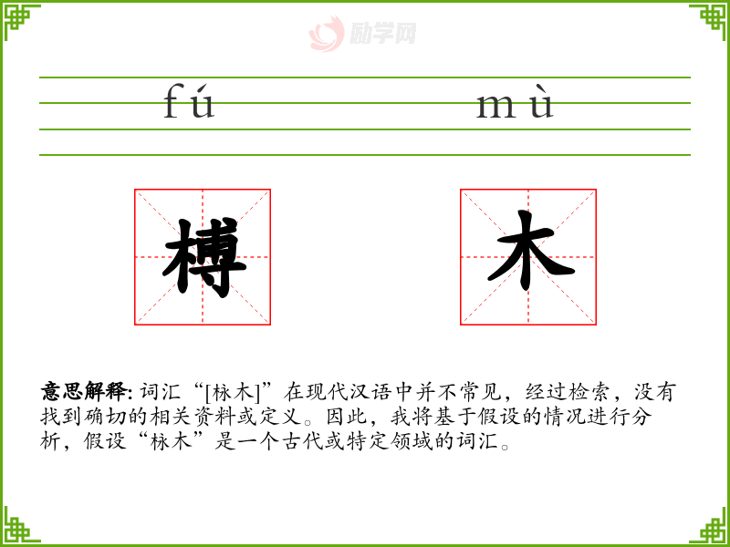 词汇“[栐木]”在现代汉语中并不常见,经过检索,没有找到确切的相关资料或定义。因此,我将基于假设的情况进行分析,假设“栐木”是一个古代或特定领域的词汇。