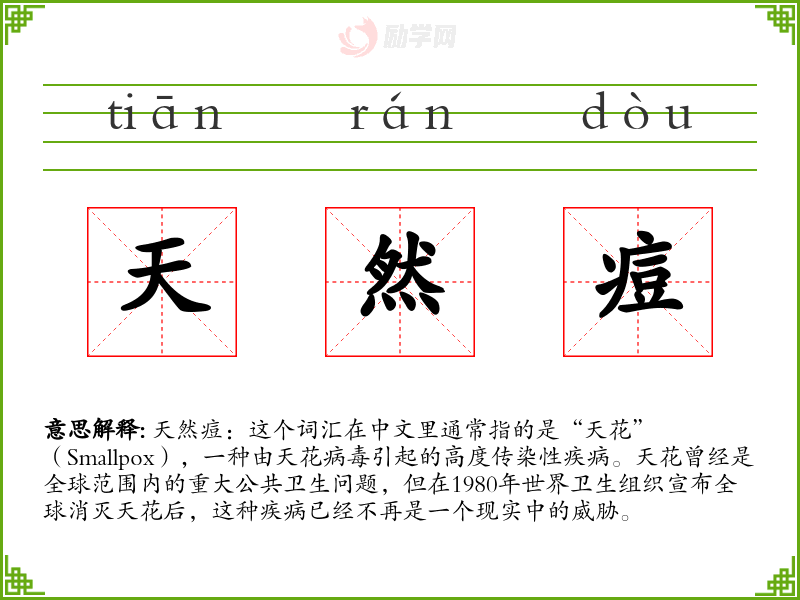 “天然痘”作为一个历史词汇,虽然不再直接关联到现实生活中的疾病,但它代表了人类历史上一个重要的篇章,即对抗和最终消灭一种致命传染病的历程。这个词汇在语言学习和表达中提醒我们医学进步的重要性,以及人类团结合作对抗共同威胁的力量。