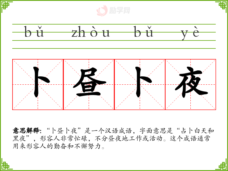 “卜昼卜夜”是一个汉语成语,字面意思是“占卜白天和黑夜”,形容人非常忙碌,不分昼夜地工作或活动。这个成语通常用来形容人的勤奋和不懈努力。