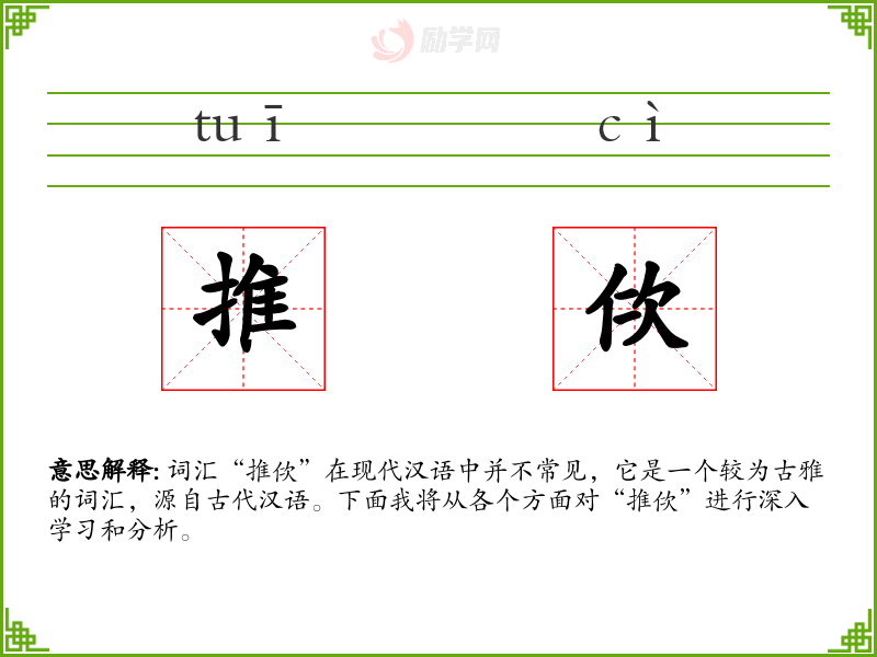 词汇“推佽”在现代汉语中并不常见,它是一个较为古雅的词汇,源自古代汉语。下面我将从各个方面对“推佽”进行深入学*和分析。