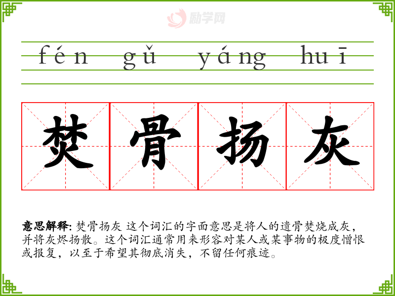 焚骨扬灰 这个词汇的字面意思是将人的遗骨焚烧成灰,并将灰烬扬散。这个词汇通常用来形容对某人或某事物的极度憎恨或报复,以至于希望其彻底消失,不留任何痕迹。