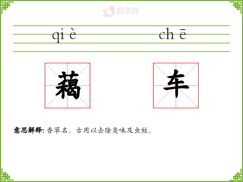 藒车的意思是:香草名。古用以去除臭味及虫蛀。