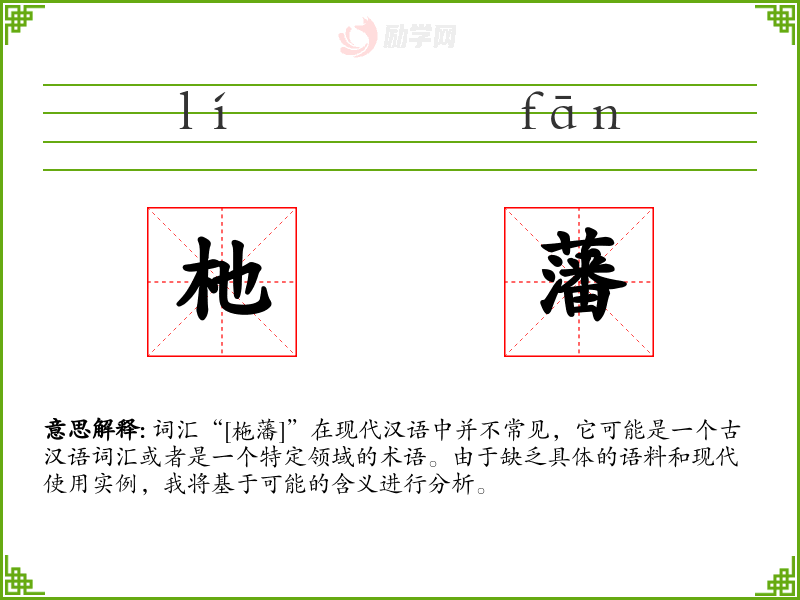 词汇“[柂藩]”在现代汉语中并不常见,它可能是一个古汉语词汇或者是一个特定领域的术语。由于缺乏具体的语料和现代使用实例,我将基于可能的含义进行分析。