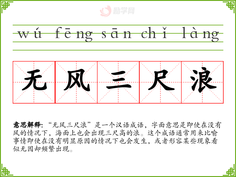 “无风三尺浪”是一个汉语成语,字面意思是即使在没有风的情况下,海面上也会出现三尺高的浪。这个成语通常用来比喻事情即使在没有明显原因的情况下也会发生,或者形容某些现象看似无因却频繁出现。