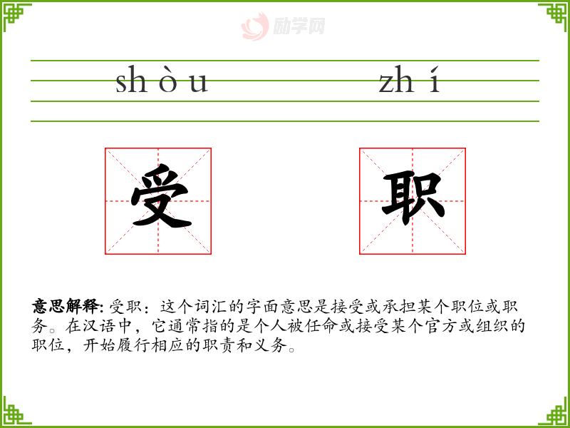 受职:这个词汇的字面意思是接受或承担某个职位或职务。在汉语中,它通常指的是个人被任命或接受某个官方或组织的职位,开始履行相应的职责和义务。