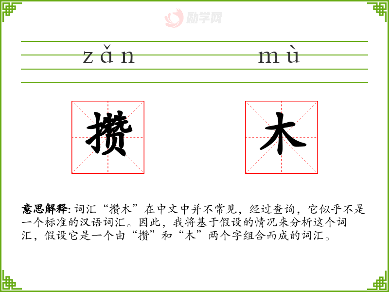 词汇“攒木”在中文中并不常见,经过查询,它似乎不是一个标准的汉语词汇。因此,我将基于假设的情况来分析这个词汇,假设它是一个由“攒”和“木”两个字组合而成的词汇。