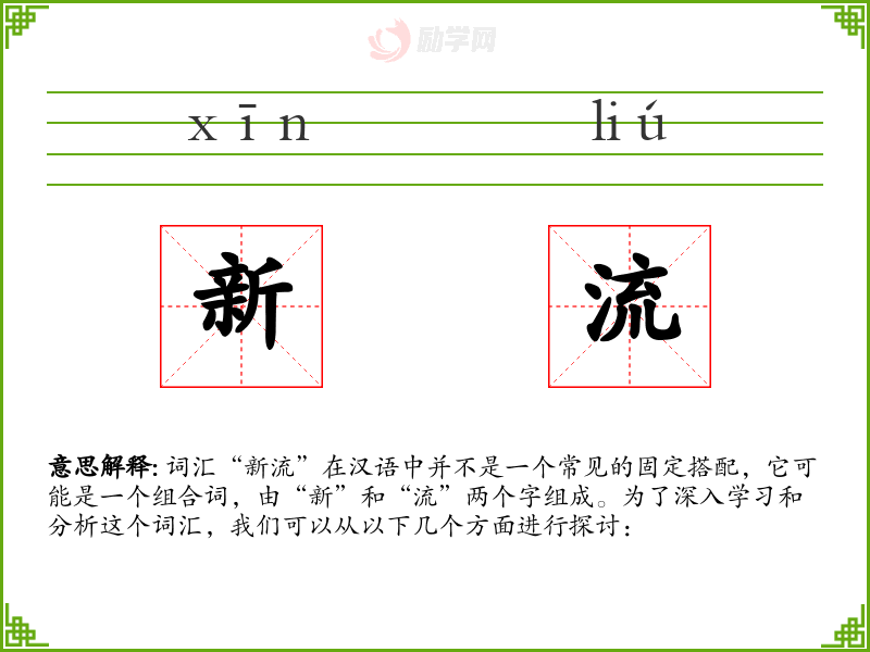 词汇“新流”在汉语中并不是一个常见的固定搭配,它可能是一个组合词,由“新”和“流”两个字组成。为了深入学习和分析这个词汇,我们可以从以下几个方面进行探讨:
