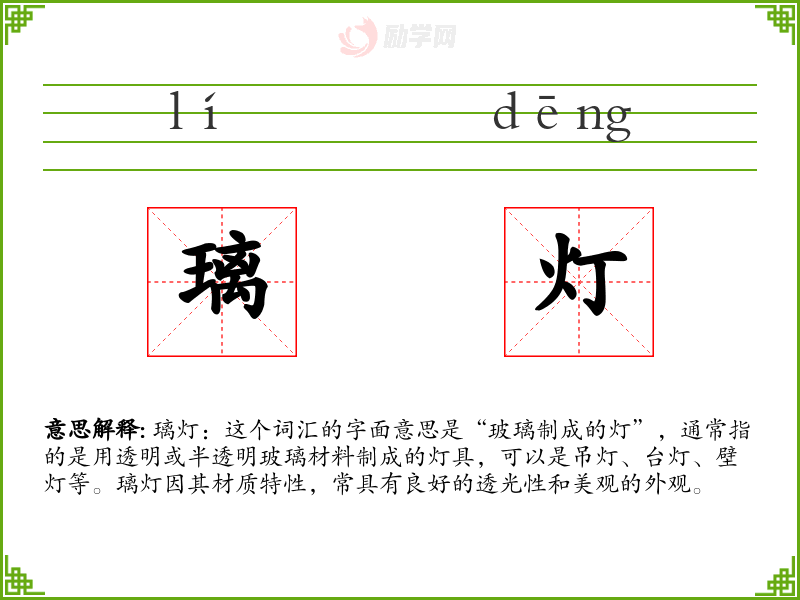 璃灯:这个词汇的字面意思是“玻璃制成的灯”,通常指的是用透明或半透明玻璃材料制成的灯具,可以是吊灯、台灯、壁灯等。璃灯因其材质特性,常具有良好的透光性和美观的外观。