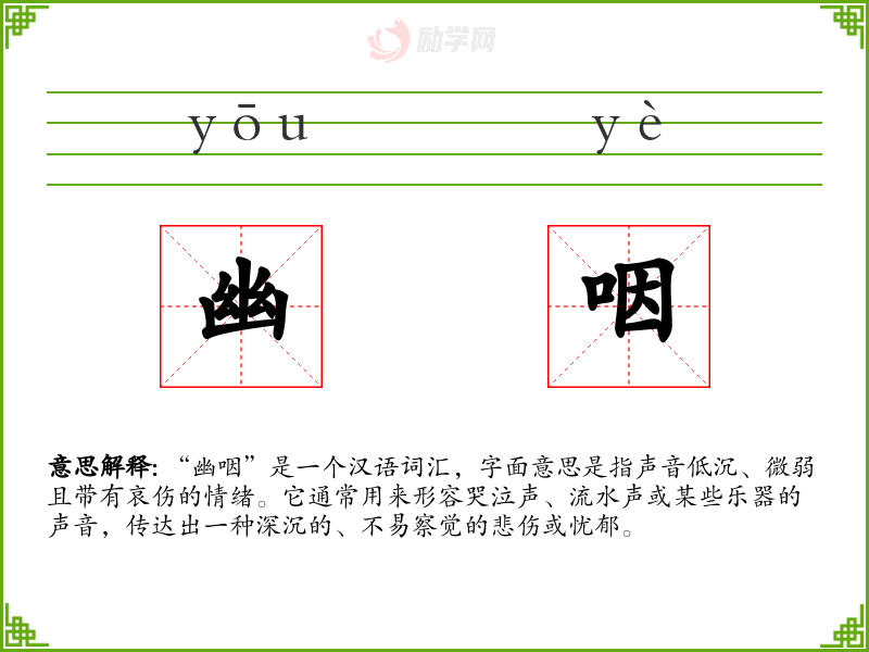幽咽的意思是:形容低微的哭声;形容低微的流水声:泉水~。