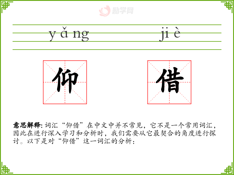 词汇“仰借”在中文中并不常见,它不是一个常用词汇,因此在进行深入学*和分析时,我们需要从它最契合的角度进行探讨。以下是对“仰借”这一词汇的分析: