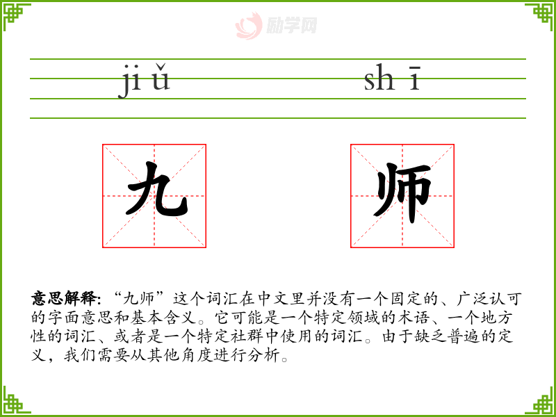 由于“九师”不是一个常见的通用词汇,它在不同语境下的使用可能非常有限。如果它出现在某个特定的文学作品、口语交流或专业领域中,那么它的含义将取决于该语境的具体规定。