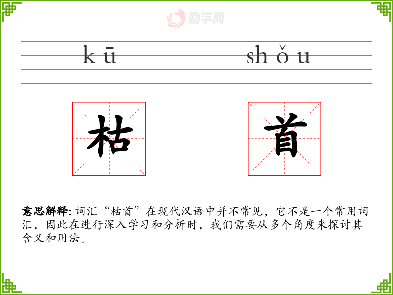 词汇“枯首”在现代汉语中并不常见,它不是一个常用词汇,因此在进行深入学*和分析时,我们需要从多个角度来探讨其含义和用法。