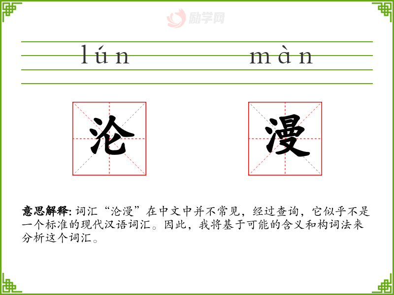 词汇“沦漫”在中文中并不常见,经过查询,它似乎不是一个标准的现代汉语词汇。因此,我将基于可能的含义和构词法来分析这个词汇。