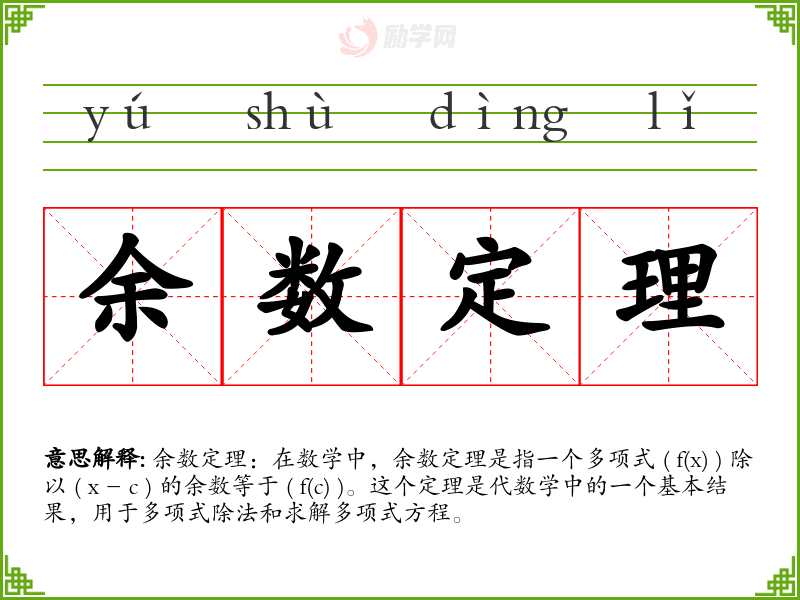 - 在代数课上,老师详细讲解了余数定理的应用。