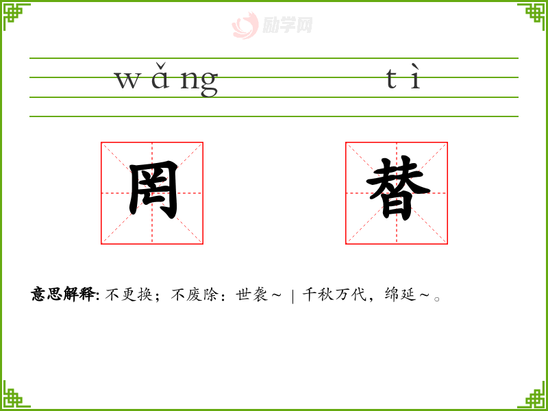罔替的意思是:不更换;不废除:世袭~|千秋万代,绵延~。