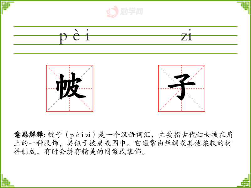 - 反义词:(由于帔子是特定服饰,反义词不太适用)