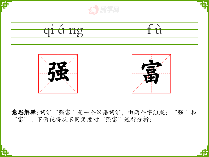 - 词源:“强”和“富”都是古代汉语中就存在的词汇,历史悠久。