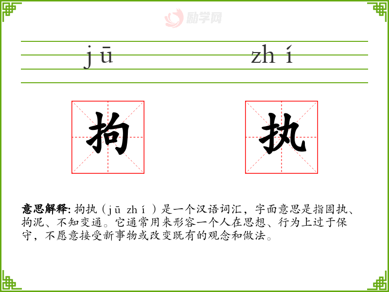 拘执(jū zhí)是一个汉语词汇,字面意思是指固执、拘泥、不知变通。它通常用来形容一个人在思想、行为上过于保守,不愿意接受新事物或改变既有的观念和做法。