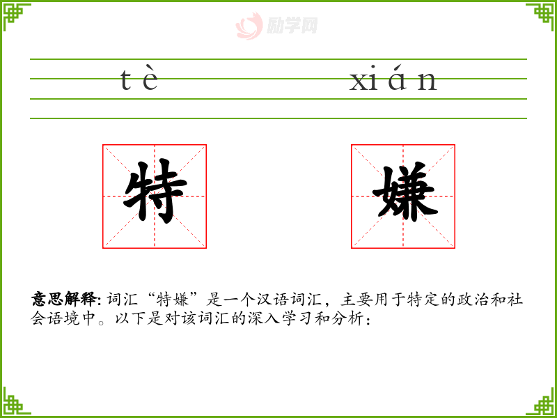 词汇“特嫌”是一个汉语词汇,主要用于特定的政治和社会语境中。以下是对该词汇的深入学*和分析: